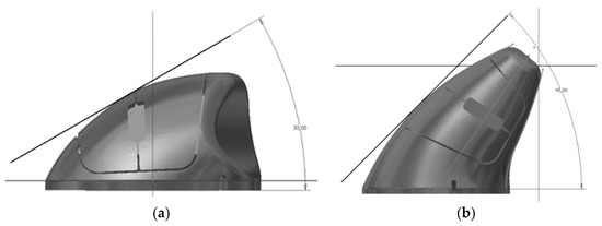 The improvement and refinement of the models corresponds to an iterative process to incorporate the desired characteristics. The 3D printed mockups were obtained through a reverse engineering (using a 3D scanner) process complemented with the transposition of the physical dimensions of the clay models by manual collection of the dimensions. Figure 3 illustrates the 3D-printed model of the ch concept. The ch geometry allows an effective curved support for the hand, and the reduction of pronation of the forearm, presenting 30° of inclination (Figure 3a). This geometry also has a pronounced cavity for the support of the thumb, allowing anchoring and stabilization during the device’s displacement. Figure 4 illustrates the 3D-printed model of the ci concept which offers support for the hand with 45° of inclination (Figure 4, Figure 5b and Figure 6b), reducing the pronation of the forearm even more, allowing a greater curved support for the hand, and promoting a close distance between distal ends of the index finger and thumb (precision grip).