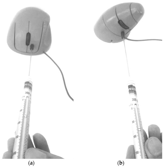 Measuring the force required to activate the buttons and dimensions of the PC mice’s fully functional prototypes. (a) ch prototype, force required to activate the buttons (70 gf = 0.687 N); (b) ci prototype, force required to activate the buttons (80 gf = 0.785 N).