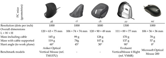 Computer usage can be associated with the development of upper extremity pain; particularly, intensive mouse use can lead to hand and forearm musculoskeletal pain/injuries [1]. On the other hand, the extended use of the PC mouse is bound to endure, because in precision computer tasks such as dragging and steering graphical targets, continuously needed in some computer applications, such as CAD, touch screens have, so far, not been able to replace the mouse [2]. Modern computer users use the mouse almost three times as much as the keyboard [3]. In this context, using the traditional horizontal mouse leads to postures that increase the risk for injury. Therefore, it is desirable to improve upper extremity posture while using a computer mouse. Regarding this problem, previous studies have found posture benefits associated with using alternative mouse designs, and have concluded that increasing mouse height and slanting the mouse’s top face can improve wrist posture without negatively affecting performance [3]. In this line of thought, Lourenço et al. (2017) [4], in an experimental set-up with 20 participants, performed usability evaluation comparing a standard mouse (Microsoft Optical 200) with an alternative vertical mouse (Evoluent VerticalMouse 4 Right), supporting the adoption of a neutral pronation forearm posture. The results of the reported comparison suggest designing hybrid configurations of computer mice to achieve a compromise between the usability parameters and the expected long-term effects on health. Previous studies suggested that a proper mouse weight could benefit users in terms of increasing movement efficiency; its dimensions and geometry should be based on anthropometry, hand gestures, and comfortable hand postures [5]. Additionally, the weight of the mouse seems to affect forearm muscle activity during speedy operation, supporting the use of lighter devices [6]. Another factor that seems to make a difference during mouse usage is the hand size of the subjects, affecting grasp position and the level of muscle activity, suggesting that a computer mouse ought to be chosen according to the size of the subject’s hand [7]. Moreover, previous tests performed on a conventional (horizontal) PC mouse revealed a statistically significant association between hand width and the effectiveness of dragging graphical targets with the middle (scroll) button of the mouse [8]. Another study carried out a set of usability evaluation tests of similar flat shape PC mice, involving 30 undergraduates. They used their own and other subjects’ PC mice. Hypothetically, subjects would not experience improved efficiency when switching to other devices from their own device. The other devices shared the archetype of the owned device, but differed in dimensions and shape details, or activation thresholds. Based on a literature review and prior experimental results, the authors suggest tentative explanations to support the understanding of cases of subjects’ improvement in efficiency when changing to unfamiliar pointing devices. Variables such as the contour and fingers’ support and the surface finish of the device are suggested as relevant, together with the relative size of the device in relation to the size of the hand, corroborating previous studies [9]. In this sense, the authors propose alternative hybrid shapes supported by a structured product design method, resulting in the development, prototyping, and implementation of an alternative slanted PC mouse [10]. Hence, the present study was conducted by compiling a set of requirements, recommendations, and guidelines towards improvements in respect to characteristics previously identified in the literature, focusing on ergonomic and usability considerations, proposing a method to develop ergonomic computer mice. Thereby, four PC mouse shapes (variants) were proposed; full-scale mockups were made based on which to apply a suitable assessment matrix; and, as a result, two fully functional computer mice models were selected (preferred) and prototyped.
