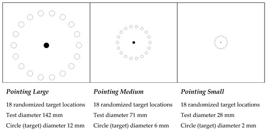 For the test tasks to evaluate the PC mice geometries, the current study follows the structure used by Odell and Jonhson [3]. Thus, to test and compare the PC mouse models of interest (Figure 9), the graphical test tasks occurred in the following way: pointing large, medium, and small (Figure 10). These tasks present three levels of difficulty through the dimensions of the circular targets and overall diameter of the test task. Pointing standardized tasks were performed with a purpose-built software; errors and times to complete tasks were also accounted for and recorded by the same software. The elapsed time between the targets and time required to complete each task was counted for a fixed number of targets, starting with the mouse click on a central target (circle), and ending when the fixed number of targets was completed. All tasks were performed in two cycles. The pointing (and clicking) task included the random activation of 12 targets per cycle (of 18 possible), totaling 24 targets (Figure 10).