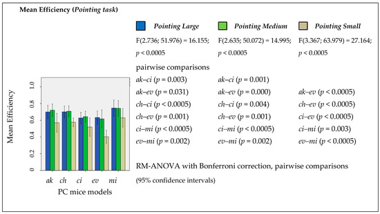 IBM SPSS was used for statistical analysis of the data. Figure 11 shows the mean efficiency in the pointing task (pointing large, medium, and small) by mouse geometries. A RM-ANOVA with Bonferroni correction was conducted to investigate the impact of PC mouse geometry on the mean efficiency achieved performing the tasks. There was a significant main effect of mice geometries (F(2.736; 51.976) = 16.155; p < 0.0005) on the efficiency in the pointing large task, as well in point medium (F(2.635; 50.072) = 14.995; p < 0.0005), and in pointing small (F(3.367; 63.979) = 27.164; p < 0.0005). Pairwise comparisons with Bonferroni adjustment for multiple comparisons revealed several significant differences between the different geometries in all three degrees of pointing tasks (Figure 11). The developed ch geometry revealed better efficiency compared with the ev vertical benchmark mouse in all levels of the pointing task: pointing large ch–ev (p = 0.001), medium ch–ev (p = 0.001), and small ch–ev (p < 0.0005). On the other hand, the developed ci geometry revealed worse efficiency compared with developed ch geometry in pointing large ch–ci (p < 0.0005) and in pointing medium ch–ci (p = 0.004). From the point of view of pointing task efficiency, the overall results show that the new developed geometries stand between the ev and mi benchmark mice, and it seems that the newly developed ch geometry is very close to the ak benchmark mouse.