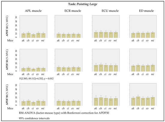 A muscle-by-muscle overview of the results of APDF10, APDF50, and APDF90 by PC mouse geometry, obtained from the pointing large graphical task, is shown in Figure 12. A RM-ANOVA, with Bonferroni correction for APDF50, was conducted to investigate the impact of PC mouse geometry on the activation of each monitored muscle (Figure 12). There was a significant main effect of mice geometries (F(2.585; 49.112) = 4.352; p = 0.012) on APL muscle activation, although pairwise comparisons with Bonferroni adjustment for multiple comparisons did not reveal significant differences between the different geometries.