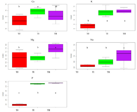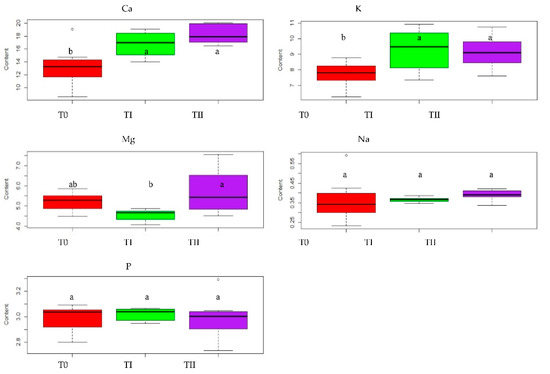The effect of treating the soil with two amendments on mean Ca, K, Mg, Na and P amounts in oat grown on soils: T0—control soil, TI—soil with compost addition and TII—soil with FA addition. In the figure, the letters denote homogenous groups.