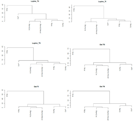 Dendrograms for values Ca:Mg, Ca:P, K:(Ca+Mg), (K+Na):(Ca+Mg), K:Mg and K:Na ratios in lupine and oat grown on soils: T0—control soil, TI—soil with compost addition and TII—soil with FA addition.