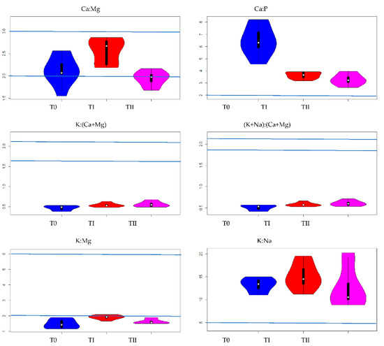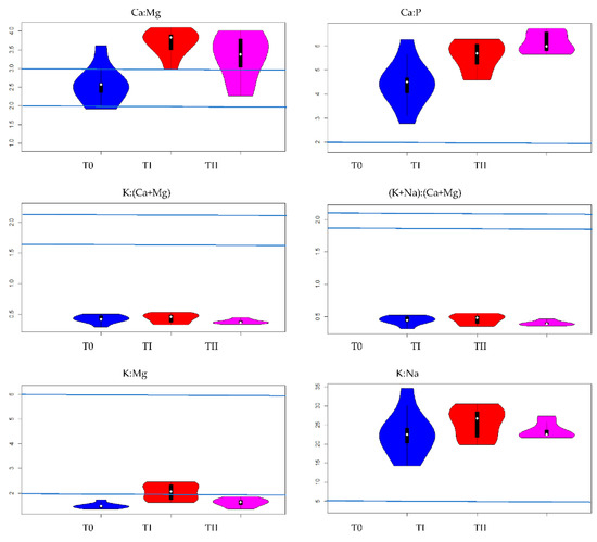 The effect of treating the soil with two amendments on values Ca:Mg, Ca:P, K:(Ca+Mg), (K+Na):(Ca+Mg), K:Mg and K:Na ratios in lupine grown on soils: T0—control soil, TI—soil with compost addition and TII—soil with FA addition. Blue lines denote recommended optimal values of nutrient ratios [8,22].