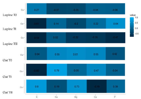 Heatmaps and correlations coefficients for between Cu content in the soils (T0–TII) and nutrients in plants: lupine and oat.