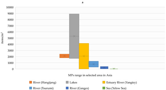 MPs have been detected in oceans around the world; however, the highest concentrations have been observed near industrialized or metropolitan areas (Figure 1). High concentrations have also been observed in enclosed or semi-enclosed seas, such as the Mediterranean Sea. Estimates assume that 20 Mt/year of MPs enters the oceans, and this amount is expected to triple by 2030 [24,25]. In the study by Deng et al. [26] where microplastic levels were investigated in industrialized areas (Shaoxing textile industry, China), the occurrence of 2.1–71.0 pcs/L in surface water and 16.7–1323.3 pcs/kg in bottom sediments was reported. In the study by Luo et al. [27] on different types of water bodies in China, it was shown that the highest number of MPs was found in freshwater bodies: 1.8–2.4 pcs/L, where the level in estuaries and coastal areas of the East China Sea (Yangtze River delta area) was at 0.9 pcs/L.