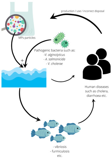 As evidenced from the previous sections, microplastics are a novel substrate for the formation of biological membranes, characterized by the distinctive community structure of the biofilm compared to the natural materials [84,85,86,87,88]. Due to their considerate fragmentation and physical properties (especially durability,) plastic particles also provide bacteria, including the above-mentioned pathogens, with an effective means of dispersion throughout the aquatic environment [86]. Van der Meulen et al. [87] in their report considering the risk assessment of “Socio-economic impact of microplastics in the 2 Seas, Channel and France Manche Region” pointed at a variety of potentially pathogenetic bacteria associated with marine litter, namely, Bacteroides thetaiotaomicron, Escherichia coli, E. fergusoni, Shewanella putrefaciens, Bacillus cereus, B. thuringiensis, Aliivibrio wodani, Stenotrophomonas maltophilia and Pseudomonas anguilliseptica. The matter is particularly significant for aquaculture, wherein interactions between humans (i.e., working staff and consumers) and farmed animals (catching, selection and consumption) are intensive. In this section, we present a review of the following: 1. etiological agents of cultured organisms’ diseases detected on plastic fragments, 2. human pathogens found on MP particles, 3. plant pathogens propagated by the pollutant, and 4. other plastic-associated issues affecting the health of aquacultural fauna.
