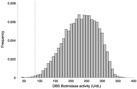 DBS biotinidase activity distribution in all the newborns screened. The dotted line represents the 85 U/dL cutoff.
