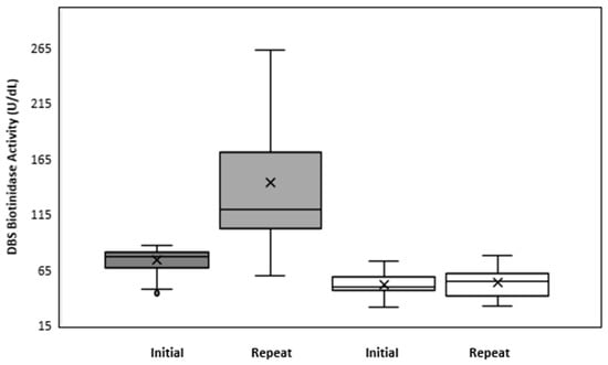 DBS biotinidase activity in false positives (gray boxes) and true positives (white boxes) at the initial and repeat DBS screening test.