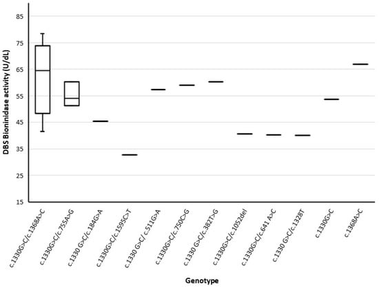 All infants affected with partial BD detected by our screening program were asymptomatic and are still followed once a year in an outpatient clinic. Treatment of profound BD is lifelong administration of biotin 5–20 mg daily, reducing the dose as the children grow []. Treatment of partial BD was initially controversial, and still concerns remain in indications, dosage, and duration. Recently, a recovery of BTD activity has been demonstrated with increasing age and mainly in subjects carrying the p.(Asp444His) variant on at least one allele. Thus, re-evaluation of BTD activity at the age of 5 years has been suggested in order to adjust or stop biotin supplementation [].