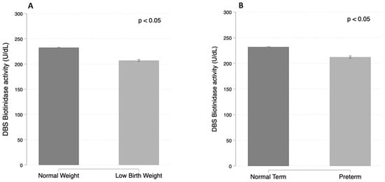 DBS biotinidase activity in relation to the birth weight (A) and to the pregnancy term (B).