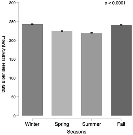 Seasonal changes of BA were observed, with values significantly lower during the summer (mean 219.3 ± 53.7 U/dL,) compared to those in all the other seasons (242.7 ± 51.1, 224.3 ± 52.63442, and 240.5 ± 50.5/dL in winter, spring, and fall, respectively); Figure 5.