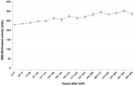 Mean biotinidase activity in DBS vs. the age at specimen collection.