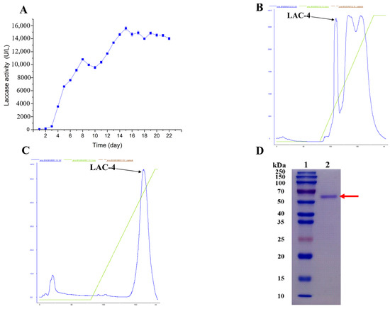 Purification of LAC-4 laccase from white-rot fungus Ganoderma lucidum. (A) Change curve of laccase production by Ganoderma lucidum in GYP medium. CuSO4 was added on the third day of incubation to induce laccase expression. (B) The chromatographic profile of LAC-4 (anion chromatography). (C) The chromatographic profile of LAC-4 (hydrophobic interaction chromatography). (D) Detection of purified LAC-4 laccase by SDS-PAGE electrophoresis. Lane 1: protein molecular mass marker; Lane 2: purified LAC-4 laccase.