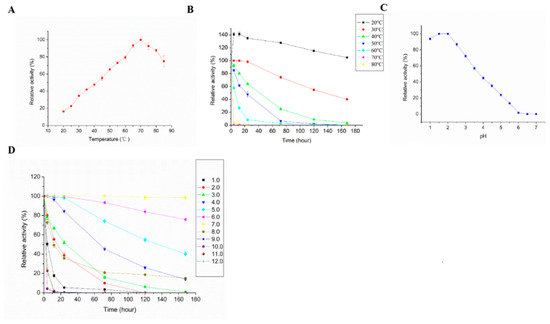 Laccase activity was measured at different temperatures (20–85 °C, at intervals of 5 °C), where the highest laccase activity value was set to 100%, and relative laccase activity at each temperature was calculated. Then, the optimal enzymatic reaction temperature for LAC-4 was determined. The reaction was carried out in 50 mM acetate buffer at a pH of 5.0, and the selected substrate was ABTS with a final concentration of 1 mmol/L. In addition, 0.01 U/mL of LAC-4 was used in the reaction system.