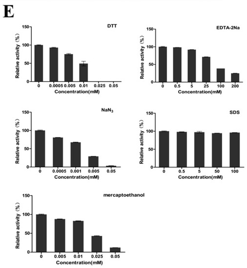DTT (0.0005, 0.005, 0.05 mM), EDTA-2Na (0.5, 5, 10, 25, 50, 100, 200 and 400 mM), NaN3 (0.0005, 0.005 and 0.05 mM), SDS (100, 200 and 400 mM) and mercaptoethanol (0.005, 0.05 and 0.5 mM) were added to the laccase reaction system, and laccase activity was measured after the sample was thoroughly mixed. Enzyme activity was measured by adding an equal volume of acetate buffer, which was used as the control and set to 100%, and the relative activity of LAC-4 under different concentrations of inhibitors was calculated for various inhibitors. The reaction was carried out in 50 mM acetate buffer at a pH of 5.0, and the selected substrate was ABTS with a final concentration of 1 mmol/L. 0.01 U/mL of LAC-4 was used in the reaction system. The reaction temperature is 30 °C.
