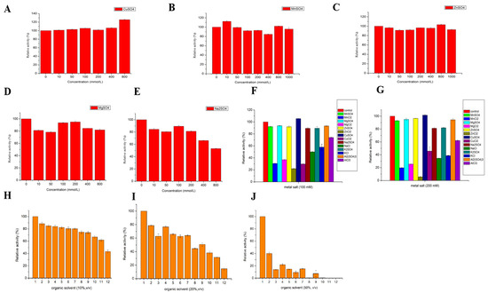 Effects of different metal ions and organic solvents on the LAC-4 laccase activity. (A) CuSO4, (B) MnSO4, (C) ZnSO4, (D) MgSO4, (E) Na2SO4, (F) Comparison of the effects of the metal salt with chloride as the anion and the sulfate ions as the anion on LAC-4 laccase activity (the concentration of metal salt was 100 mM), (G) Comparison of the effects of the metal salt with chloride as the anion and the sulfate ions as the anion on LAC-4 laccase activity (the concentration of metal salt was 200 mM), (H) Concentration of organic solvent was 10% (v/v), (I) Concentration of organic solvent was 20% (v/v), (J) Concentration of organic solvent was 50% (v/v). (H–J): 1: Control, no addition of any organic solvent; 2: Ethylene glycol; 3: Butanediol; 4: Glycerol; 5: Propylene glycol; 6: Ethanol; 7: Methanol; 8: Isopropyl alcohol; 9: Acetonitrile; 10: Acetone; 11: DMSO; 12: DMF.