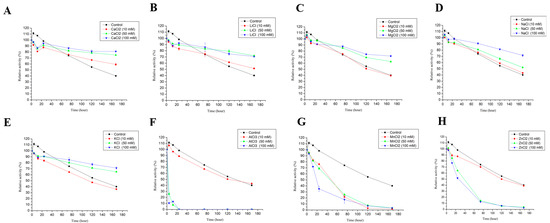 Effects of different metal ions on the stability of LAC-4 laccase. (A) CaCl2, (B) LiCl, (C) MgCl2, (D) NaCl, (E) KCl, (F) AlCl3, (G) MnCl2, (H) ZnCl2. Control, no addition of any metal ion.