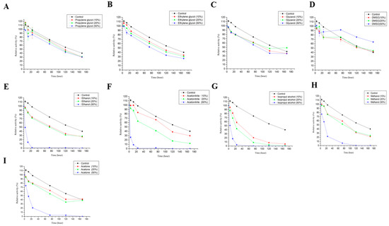 Effects of different organic solvents on the stability of LAC-4 laccase. (A) Propylene glycol (B) Ethylene glycol (C) Glycerol (D) DMSO (E) Ethanol (F) Acetonitrile (G) Isopropyl alcohol (H) Methanol (I) Acetone. Control, no addition of any organic solvent.