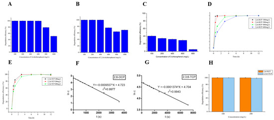 Degradation of chlorophenols with different structures by LAC-4. (A) Degradation of different concentrations of 2,6-DCP by LAC-4. (B) Degradation of different concentrations of 2,3,6-TCP by LAC-4. (C) Degradation of different concentrations of 3-CP by LAC-4. (D) The time-course degradation curve for the different concentrations of 2,6-DCP. (E) The time-course degradation curve for the different concentrations of 2,3,6-TCP. (F) The ln c-t curve for LAC-4 degradation of 2,6-DCP. (G) The ln c-t curve for LAC-4 degradation of 2,3,6-TCP. (H) Degradation of the 2,6-DCP and 2,3,6-TCP mixture by LAC-4. The concentration of 2,6-DCP and 2,3,6-TCP in the mixture was 100 mg/L, 200 mg/L, respectively.