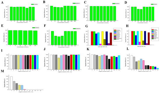 The effects of different metal ions on the LAC-4 laccase activity are shown in Figure 3, indicating that LAC-4 had strong tolerance for CuSO4, ZnSO4, MnSO4, MgSO4, Na2SO4 (Figure 3A–E). The activity of LAC-4 was retained above 80% in these metal ion solutions, which had concentrations equal to or less than 200 mM. When the concentrations of CuSO4, ZnSO4, MnSO4, MgSO4, Na2SO4 were 800 mM, LAC-4 activity reached 125.64%, 103.30%, 102.06%, 82.01%, 52.99%, respectively. Thus, CuSO4 greatly increased the activity of LAC-4 laccase. LAC-4 exhibited the strongest tolerance for MnSO4 and ZnSO4. Even when the concentrations of MnSO4 and ZnSO4 increased to 1000 mM, LAC-4 laccase activity still reached 95.82% and 92.73%, respectively, and high activity was maintained. The extremely high concentrations of MnSO4 and ZnSO4 did not affect the activity of LAC-4 (Figure 3B,C).