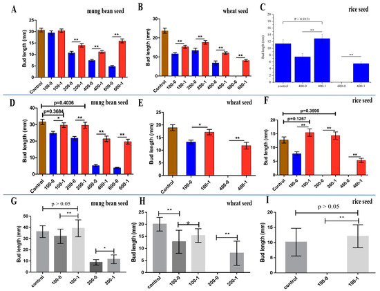 The germination of three plant seeds was used as an index to detect the phytotoxicity of chlorophenol before and after degradation. Rice seeds were washed with distilled water and soaked at 30 °C for 12 h, allowing them to germinate. Rice seeds with full grains and signs of germination were selected for the experiment. A piece of Whatman filter paper was placed in each dish, 20 rice seeds with full grains were randomly placed on the filter paper, and 4 mL of distilled water (blank control group), undegraded 2,6-DCP (undegraded experimental group) or 2,6-DCP (degradation product of the experimental group) degraded by laccase was added. The filter paper was soaked completely, and the dishes were placed in a 28 °C biochemical incubator for dark cultivation for 120 h. To ensure that the seeds had sufficient oxygen, the lid of the dish was opened every 24 h for 5 min. After 120 h of cultivation, the root length and shoot length of the rice seeds were measured, and the germination rate was calculated: germination rate = (number of seeds germinated/total number of seeds) × 100%.