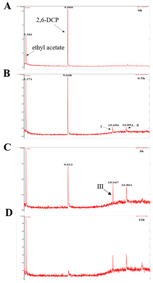 The dosage of LAC-4 was 1 U/mL, the concentration of 2,6-DCP was 600 mg/L, and the degradation reaction system volume was 2 mL. After the preparation of the degradation system, it was placed at 30 °C for reaction. The system without enzyme solution was taken as the 0 h sample, and samples were collected at 0.5 h, 3 h and 12 h for extraction. Four degradation samples were measured in parallel at each time point. At each time point, the degraded sample was extracted with ethyl acetate multiple times to ensure full extraction, and then the extracted organic phase was separated and concentrated. The extracted sample was filtered using a 0.22 μm microporous filter and was then subjected to GC-MS detection. Gas chromatography-mass spectrometry instrument: Varian450-GC, 320-MS; Chromatographic column: VF-5 chromatographic column (30 mm × 0.25 mm). The GC-MS detection conditions were as follows: the initial column temperature was 50 °C for 3 min; the temperature was linearly increased to 290 °C at a rate of 20 °C/min and was maintained for 10 min. The inlet temperature was 280 °C, and the ion source EI temperature was 200 °C.
