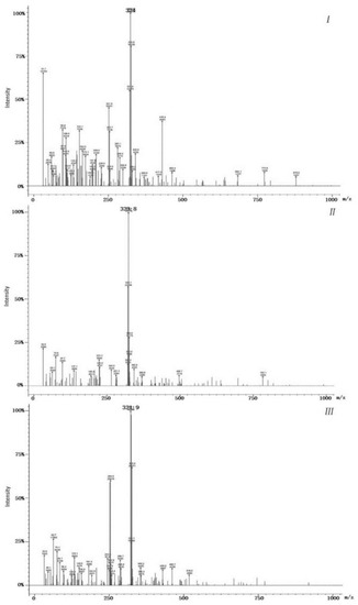 The MS results of the two intermediate products produced during the conversion process of 2,3,6-TCP by LAC-4 are shown in Figure 14. GC-MS detected two intermediate products: product I, which had a retention time of 16.517 with a m/z of 391.8, and product II, which had a retention time of 17.801 with a m/z of 391.8. The m/z of 2,3,6-TCP was 196, and the m/z values of the two intermediate products from the degradation of 2,3,6-TCP by LAC-4 were identical (both were 391.8) (Figure 14). Based on the above data, we speculated that during the degradation of 2,3,6-TCP, LAC-4 completed the conversion of 2,3,6-TCP through polymerization, forming dimers. This was similar to the mechanism by which LAC-4 degraded 2,6-DCP.