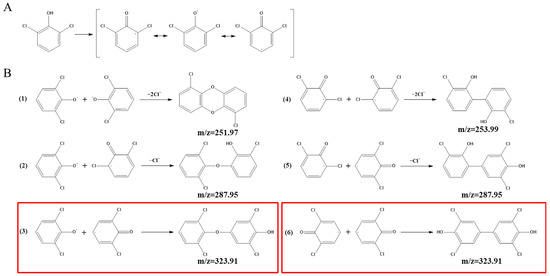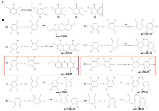Free radicals generated by 2,3,6-TCP catalyzed by LAC-4 laccase (A) and the coupling reaction between the free radicals (B). 2,3,6-TCP was first oxidized by LAC-4 laccase, generating four chemically stable free radicals (A, ①–④); then, ten possible coupling reactions randomly occurred between the free radical monomers (B, (1)–(10)).