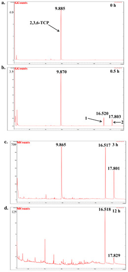 The intermediate products resulting from 2,3,6-TCP degradation by LAC-4 were analyzed by gas chromatography-mass spectrometry (GC-MS), and the GC detection results of 2,3,6-TCP degradation by LAC-4 at different points in time are shown in Figure 13. At the beginning of the reaction (0 h), only one substance peak was detected, which was 2,3,6-TCP (9.885 min). After reacting for 0.5 h, two new substance peaks appeared (substance 1 (16.517 min) and substance 2 (17.801 min)). With prolonged reaction time, the 2,3,6-TCP peak gradually decreased, and the peaks for the new substances gradually increased. After 12 h, the peak for 2,3,6-TCP almost completely disappeared (Figure 13).