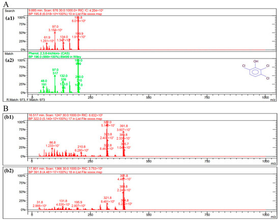 Mass spectrum (MS) of degradation products of 2,3,6-TCP degraded by LAC-4. (A) Mass spectrum of 2,3,6-TCP. (a1) is the MS detection result of 2,3,6-trichlorophenol (not degraded). (a2) is the database matching result. (B) Two intermediate products were detected by GC-MS: product I (b1), which had a retention time of 16.517 min with a m/z of 391.8, and product II (b2), which had a retention time of 17.801 min with a m/z of 391.8.