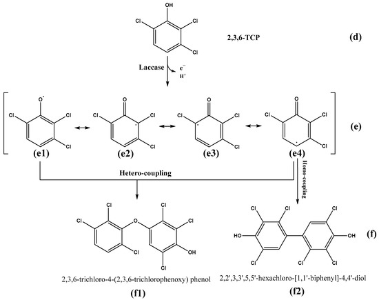 Thus, conversion reactions of the two chlorophenols 2,6-DCP and 2,3,6-TCP by LAC-4 laccase shared a common attribute; specifically, the free radicals that formed from the oxidization of 2,6-DCP and 2,3,6-TCP by LAC-4 laccase produced dimers as a result of the polymerization reactions. In summary, LAC-4 catalyzed the polymerization of 2,6-DCP and 2,3,6-TCP, forming dimer products.