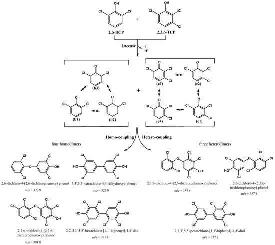 In summary, the degradation products of an equivalent mixture of 2,6-DCP and 2,3,6-TCP catalyzed by LAC-4 laccase contain four homodimers and three heterodimers.