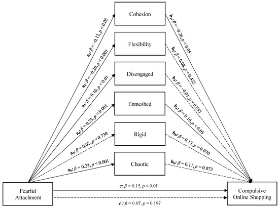 Parallelly, Fearful Attachment showed a significant total effect on Compulsive Online Shopping (Path c in Figure 2; β = 0.15, p < 0.01, LLCI = 0.022—ULCI = 0.134). Furthermore, Fearful Attachment was significantly associated with Cohesion (Path a1 in Figure 2; β = −0.12, p < 0.05, LLCI = −0.967—ULCI = −0.023), Flexibility (Path a2 in Figure 2; β = −0.20, p < 0.001, LLCI = −1.062—ULCI = −0.299), Disengaged (Path a3 in Figure 2; β = 0.16, p < 0.01, LLCI = 0.157—ULCI = 0.862), Enmeshed (Path a4 in Figure 2; β = 0.25, p < 0.001, LLCI = 0.420—ULCI = 1.072), and Chaotic (Path a6 in Figure 2; β = 0.23, p < 0.001, LLCI = 0.347—ULCI = 0.998) Family Functioning patterns. Only Cohesion (Path b1 in Figure 2; β = −0.26, p < 0.05, LLCI = −0.056—ULCI = −0.006) and Enmeshed (Path b4 in Figure 2; β = 0.16, p < 0.05, LLCI = 0.003—ULCI = 0.051) Family Functioning were, in turn, significantly associated with Compulsive Online Shopping. Entering the Family Functioning patterns in the model parallelly, only Cohesion and Enmeshed Family Functioning played a statistically significant role in the relationship between Fearful Attachment and Compulsive Online Shopping, at a level whose direct effect was nonsignificant after controlling the mediators (path c’ in Figure 2; β = 0.07, p = 0.197; LLCI = −0.019—ULCI = 0.094). Therefore, a total mediation occurred (R2 = 0.151, F(7, 298) = 7.581, p < 0.001; see Figure 2). Furthermore, the significance of the model was supported by the bootstrap procedure, which confirmed the statistical relevance of the indirect effect (Boot LLCI = 0.014—Boot ULCI = 0.074).