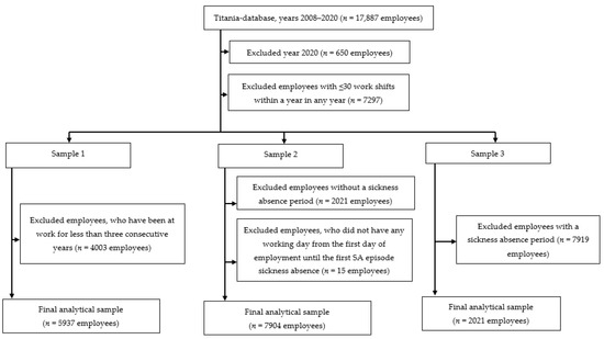 The data on working hours of one hospital district in Finland were obtained from the shift scheduling program Titania®, which is the payroll-based employer-owned digital programme for scheduling and monitoring working hours. The working hour data included start/end of work and absences including days off, sickness absences and other leaves, work unit, and type of shift work [6]. The data over the follow-up from 1 January 2008 to 1 November 2020 were used. In total, we acquired the data for 17,887 hospital employees working in the hospital district between 2008 and 2020. We excluded the year 2020 (n = 650 employees) due to incomplete working hour data for 2020. The sample formation, exposure time, and follow-up time for samples 1, 2, and 3 are presented in Figure 1.
