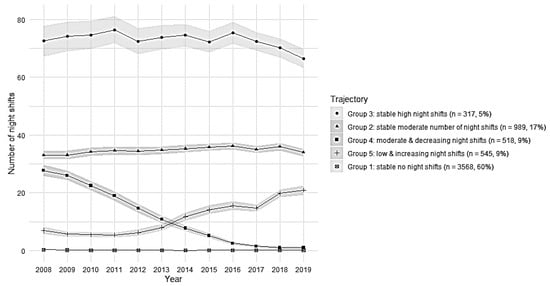 Another hypothesis was related to ageing, as previous studies suggest that older employees work fewer night shifts [23,31,32], i.e., the frequency of night work decreases over time. Some of the trajectories indicated a decreasing trend in the number of night shifts over time. However, older age was also associated with a lower likelihood of belonging to the trajectory groups with decreasing trend in night shifts.
