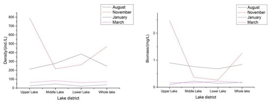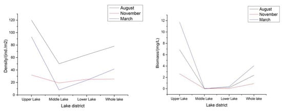 The fish productivity of benthic animals was 310,000 kg. There are many fishes that feed on benthic animals, mainly demersal fish in shallow waters, such as black carp, carp, crucian carp, Pelteobagrus fulvidraco, and bitterlings. These fishes, though growing slower than silver carp and bighead carp and being smaller, are high-quality fish, favorable in price, and mostly settled fishes showing ecological diversity. Figure 3 provides the trends in the density and biomass of benthos in each lake area of Shengjin Lake. With the change in seasons, the density and biomass of the three lake areas of Shengjin Lake changed greatly. The density of Shengjin Lake and the upper lake is the highest in August, followed by March, and is the lowest in November. The density variation law of the middle lake and the lower lake is the highest in August, followed by November, and is the lowest in March. The biomass and density of Shengjin Lake showed similar seasonal changes.