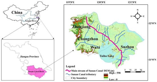 The Sunan Canal, also known as the Jiangnan Canal, is one of the earliest formed sections of the Beijing-Hangzhou Grand Canal and is located in the Taihu Lake water network plain downstream of the Yangtze River. It mainly includes four cities in Jiangsu province and a small part of Shanghai city and Zhejiang province. The Jiangsu section of the Sunan Canal runs through the four economically developed cities of Zhenjiang, Changzhou, Wuxi, and Suzhou (Figure 1). It starts from the mouth gate of the Yangtze River Jianbi in Zhenjiang in the north and ends at the junction of Jiangsu and Zhejiang in the south at Yazi Dam, with a total length of about 212.5 km and an area of approximately 19,600 km2. It connects about 6000 km of waterways in the Taihu Lake area into a network, playing the role of water regulation and transshipment. In addition to being a “golden waterway” for shipping, it also has essential functions such as flood control, water drainage, irrigation and water supply, and landscape.