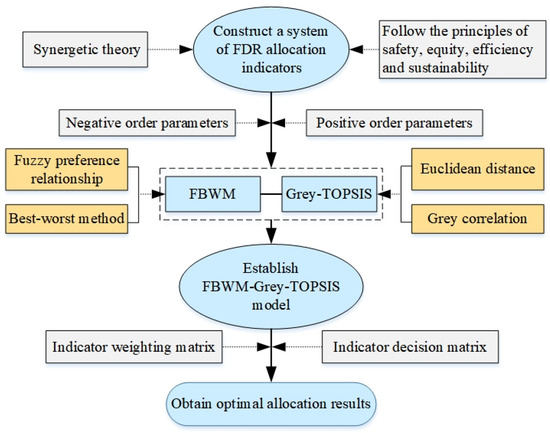 To alleviate drainage conflicts and reduce overall flood hazard losses in the watershed, this paper investigates the watershed FDR allocation problem. Firstly, based on the synergetic theory, the FDR allocation indicator system is constructed with the economic subsystem, social subsystem, and natural environment subsystem as the core. Secondly, the FBWM-Grey-TOPSIS method is proposed by integrating FBWM, a frontier method in MCDM, with Grey-TOPSIS. FBWM mothed can resolve the ambiguity and uncertainty in the real environment by incorporating FPR into BWM and obtaining the weights of the indicators. Grey-TOPSIS method, which incorporates Euclidean distance and grey correlation, is used to obtain a more reliable optimal allocation result. Finally, a case study of the Jiangsu section of the Sunan Canal in China is conducted by applying the FDR allocation indicator system and the FBWM-Grey-TOPSIS method. The distribution results show that the percentage of FDR received by Changzhou, Suzhou, Wuxi, and Zhenjiang are 32.69%, 24.88%, 23.01%, and 19.42%, respectively. The result is consistent with the objective of FDR allocation, which fully takes into account the differences in a regional social, economic, and natural environment. It provides guidance and reference for the government to use non-engineering means to improve the flood control system.