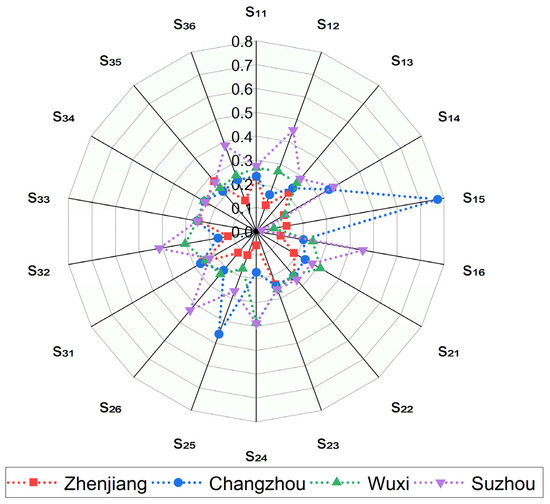 According to Figure 3, Suzhou and Changzhou performed better on Engel coefficient (s14), while Wuxi and Zhenjiang were worse. Changzhou had the highest flood direct economic loss (s15), while the other three cities had lower values, especially Suzhou, whose value was much lower than Changzhou. This indicates that Changzhou is at greater risk of flooding than other cities because it will experience heavy rainfall that occurs once every 100 years, resulting in water levels well above warning levels. Wuxi had the largest value on population density (s21), while Zhenjiang had the smallest. The distribution of per capita GDP (s11), per capita disposable income (s13), employment rate (s22), urbanization rate (s23), annual rainfall (s31), green coverage (s33), sewage treatment rate (s34), and water quality compliance rate in water functional areas (s35) were relatively average. Changzhou had the best performance on water construction investment (s25), whereas Zhenjiang had the least. The remaining order parameters were similarly distributed, with Suzhou being the largest and Zhenjiang the smallest.