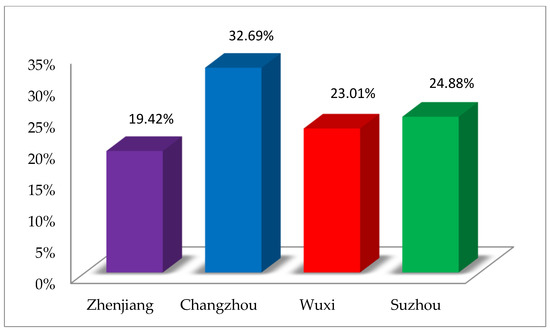 Wuxi City is downstream of Changzhou, and the flood water discharged from Changzhou will inevitably affect it. At the same time, the flood damage caused by the stronger rainfall in Wuxi is also greater, and more drainage rights need to be allocated. Suzhou is situated downstream of the canal, and although it receives the least amount of rainfall, it is most threatened by upstream drainage. Meanwhile, it has the most developed economy, and many indicators are better than those of other cities, so the proportion of drainage rights allocated is only less than that of Changzhou. Zhenjiang City is located in the upstream section of the canal with relatively poor performance on most indicators and therefore has the smallest share in the FDR allocation. This is also consistent with the fact that Zhenjiang has only one major outlet, the Jianbi pumping station, which means that there is less room for drainage regulation through manual pumping stations.
