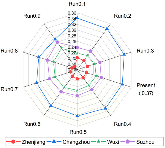 Sensitivity analysis helps reduce uncertainty in parameters and perceptions and plays an important role in determining the robustness of the solution [61]. The primary purpose of sensitivity analysis is to find the stability of the optimal solution under parameter variations [62]. Figure 5 shows that Changzhou has the largest proportion in the FDR distribution results, thereby influencing the proportion of other cities. Since small changes in indicator weights may make significant changes in the final ranking [63], sensitivity analysis can test the bias and robustness of the results by changing the information about the decision maker’s fuzzy preferences [64]. When the weights of the social subsystem vary between 0.1 and 0.9, the weights of the other subsystems vary accordingly, as shown in Table 7. At the same time, the optimal FDR assignment scheme is also changed, and the corresponding allocation results are shown in Figure 5. Due to space constraints, details about the variation of order parameter weights and rankings are not shown in this study, interested readers can contact us.