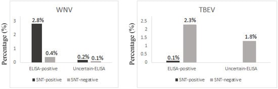 Among the 28 (2.3%; 95% CI 1.6–3.4) ELISA-positive samples for TBEV, 1 (0.1%; 95% CI 0.1–0.5) were positive by SNT, and none of the serum samples with equivocal ELISA result (1.3%, 16/1200; 95% CI 0.8–2.2), had positive SNT results (Figure 1).