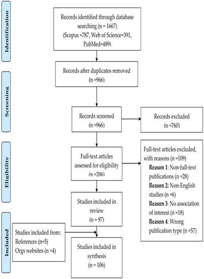 - Tricco, A.C.; Lillie, E.; Zarin, W.; O’Brien, K.K.; Colquhoun, H.; Levac, D.; Moher, D.; Peters, M.D.J.; Horsley, T.; Weeks, L.; et al. PRISMA extension for scoping reviews (PRISMA-ScR): Checklist and explanation. Ann. Intern. Med. 2018, 169, 467–473. [Google Scholar] [CrossRef] [Green Version]