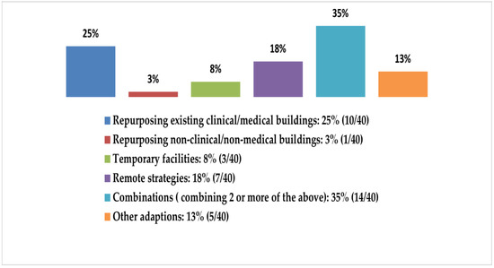 | [30,40] | Adaptations in outpatient department (OPD) | • Considerable shift to telemedicine owing to: (i) temporary shutdown of outpatient clinics; (ii) use of outpatient facilities as centers for COVID-19 purposes, such as hospitalizations, treatments, isolations, testing, etc. • Adoption of the strategy known as “Hospitals Without Walls *” • Patient’s symptoms and temperature checking, preferably upon arrival to OPD; occasionally remotely |