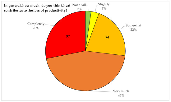 - SECTION B—RISK PERCEPTION—questions on the qualitative dimensions of the risk [29,30,31] associated with heat stress, i.e., general risk perceived, voluntary nature, immediacy of effects, personal knowledge, scientific knowledge, novelty, chronic/catastrophic, common/terrifying, future generations, control of severity, visibility, personal exposure, collective exposure, severity of consequences (questions 26 to 43 on a 5-point Likert scale from 1 = “strongly disagree” to 5 = “strongly agree”);