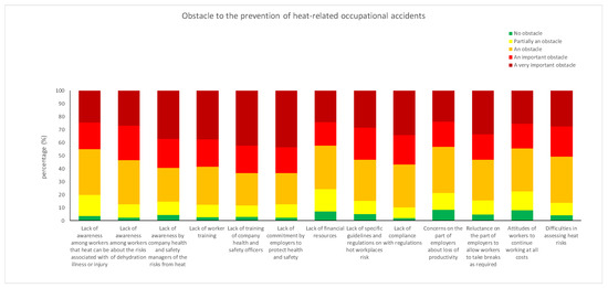 - Lack of training of workers (m = 3.81, sd = 1.12); especially of those with higher education (m = 3.96, sd = 1.04, F = 8.85, p = 0.003), those not trained in heat injury prevention (m = 3.94, sd = 1.06, F = 13.26, p = 0.000), and those working in large companies (m = 4.02, sd = 1.08, F = 3.23, p = 0.023).