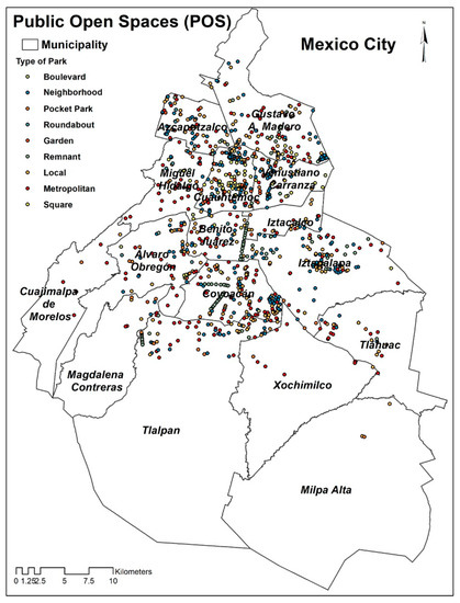 At the time of this research, there was not a unique definition of POS, each public organization or government used a different definition, making it difficult to have a clear definition or understanding of these spaces. POS were also classified in accordance with the local urban norms defined by the federal, state, and local governments, where these spaces are defined mainly as green spaces and grey areas. However, a definition by the Authority of Public Spaces [26], which classify these areas by their dimensions and uses, was considered, and used as follows: neighbourhood, locals, metropolitans, remnant, squares, pocket, gardens, roundabout, and boulevards.