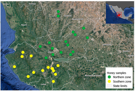Honey samples were collected from 30 hives (16 in the north zone and 14 in the south zone). The criterion for choosing the sampling places was based on selecting the municipalities that contributed >60% of the honey produced in 2016 [41], which are distributed in 12 regions along the state (Figure 1).